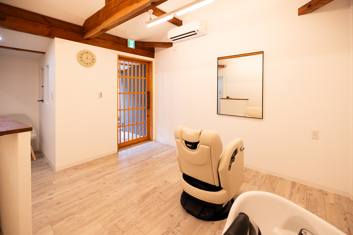 木の梁はそのままに解放感のある天井が、プライベートサロンに来られたお客様に満足感を与えてくれることでしょう。